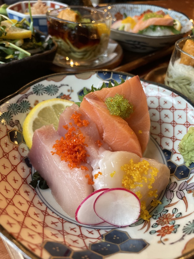 My favourites: Salmon sashimi, tuna onigiri; uni matcha soba