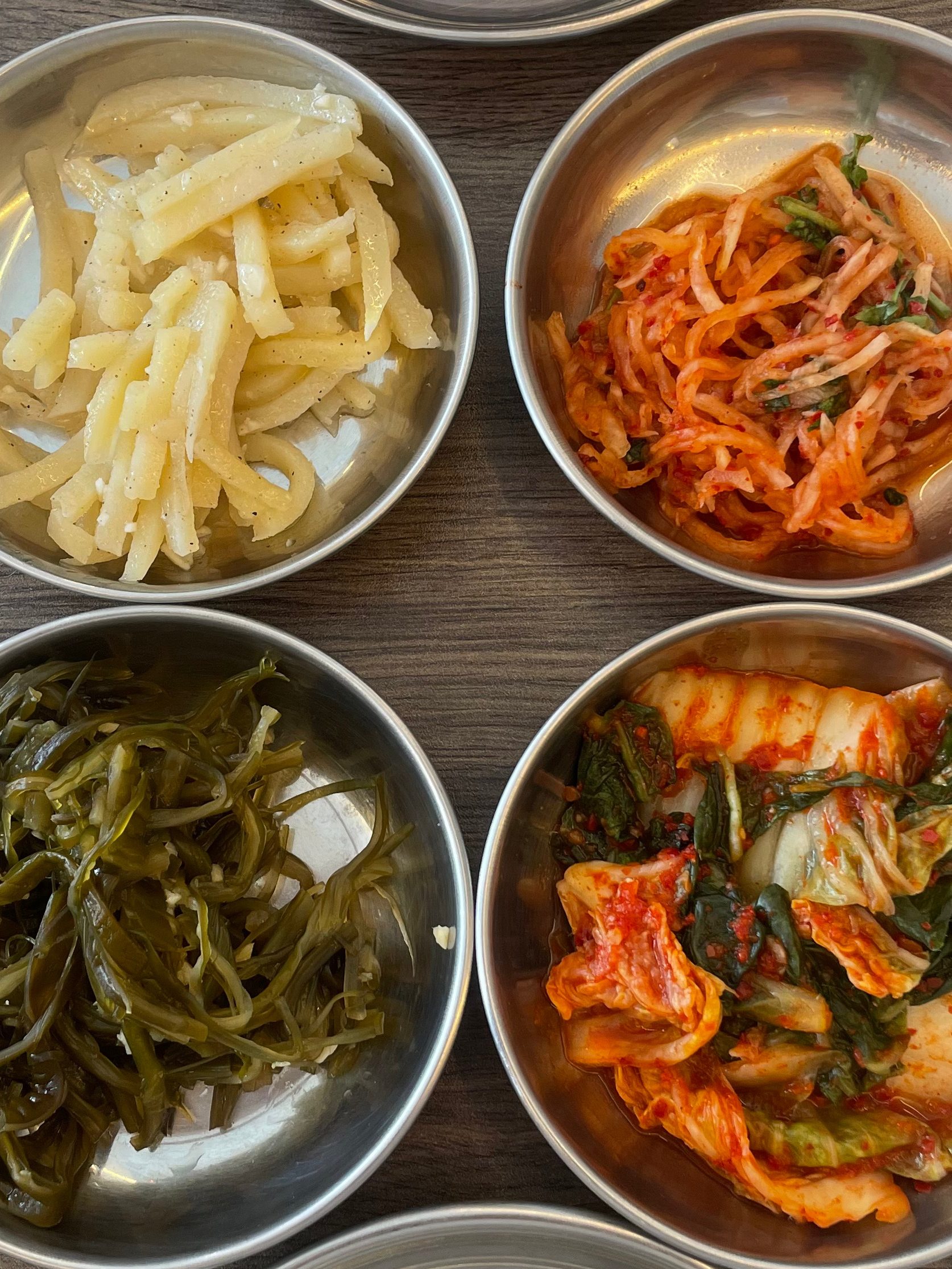 Mukja serves a variety of sides, each with its own unique flavour, including seaweed salad, radish, bean sprouts, and a few other tasty options. And you’ll never get tired of their delicious kimchi. It’s so good, I always buy a whole tub at their Korean grocery store across the street!