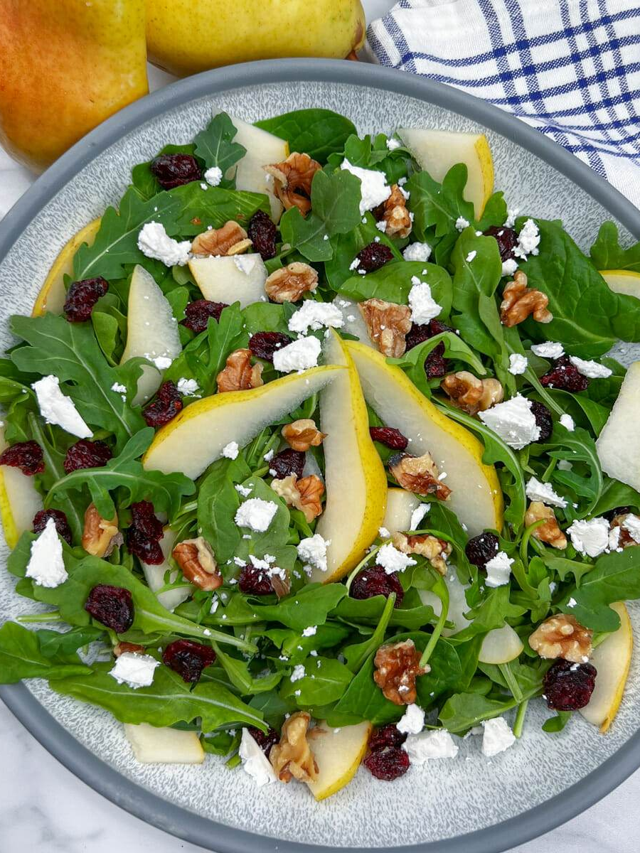 Getty Stewart’s pear and arugula salad with walnuts, cranberries, and feta