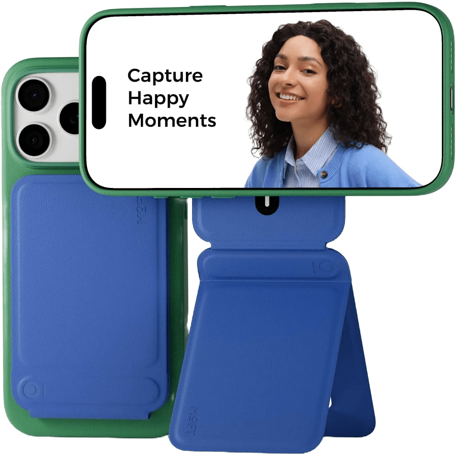 This lightweight and compact magnetic card sticks to the back of your phone, and unfolds into a full 8 inch tall tripod with adjustable heights and angles.